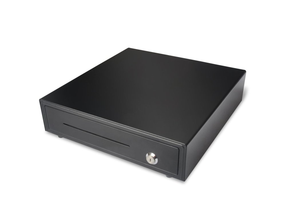 Kovová pokladní zásuvka k POS systému nebo k registračním pokladnám ovládaná napětím 12 V nebo 24 V, v černé barvě.